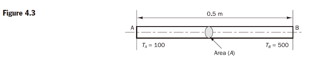 Consider the problem of source-free heat conduction in an insulated rod whose ends are maintained at constant temperatures of 100°C and 500°C respectively. The one-dimensional problem sketched in Figure 4.3 is governed by