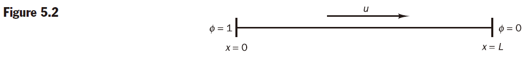 A property $\phi$ is transported by means of convection and diffusion through the one-dimensional domain sketched in Figure 5.2. The governing equation is